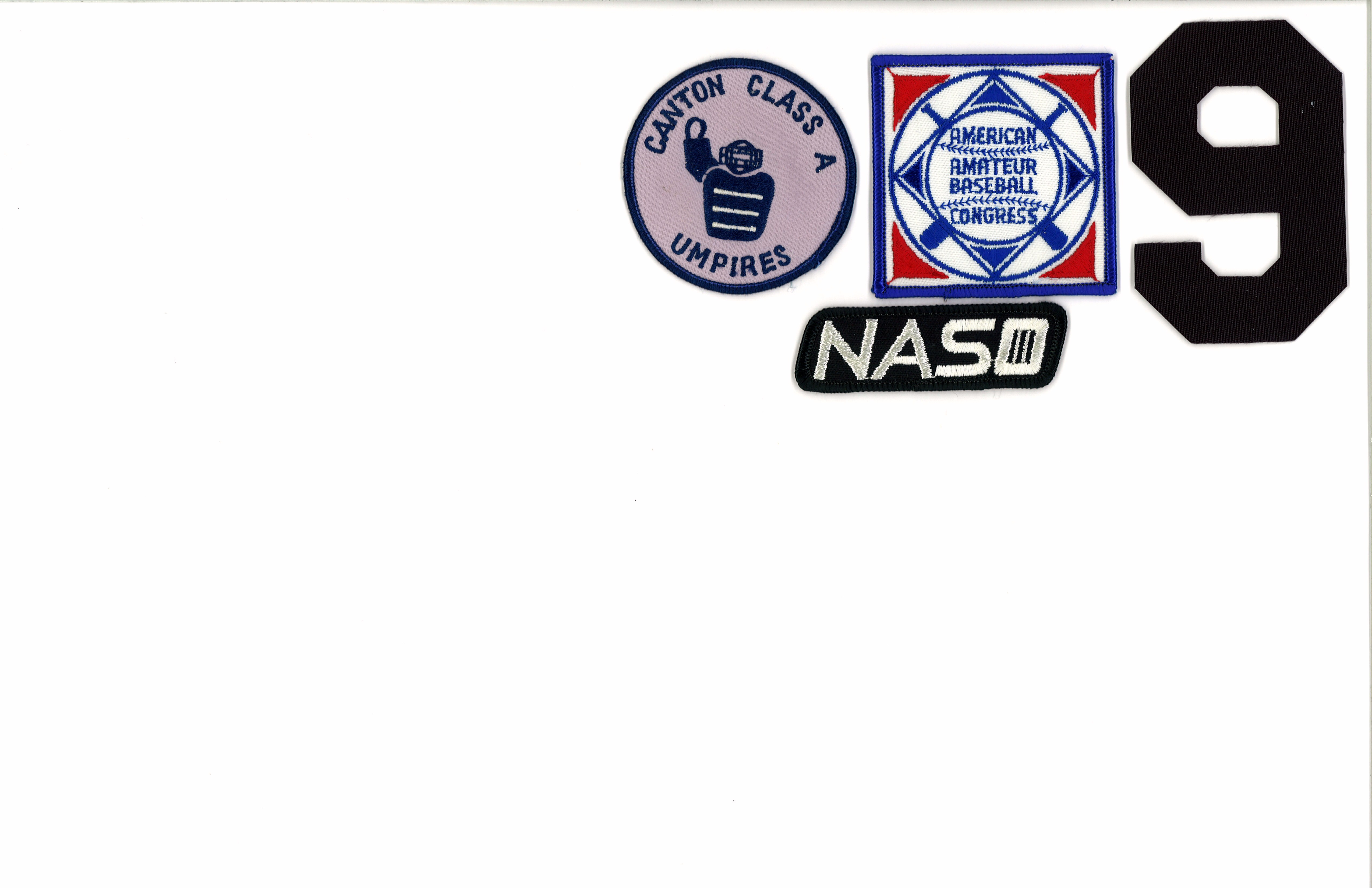 A picture of the shirt patches my wife Diane patiently sewed on to all of my umpire shirts. That is the main reason I chose the number nine when Summit Umpires started wearing numbers so she wouldn’t have to sew double digit numbers on to every shirt.